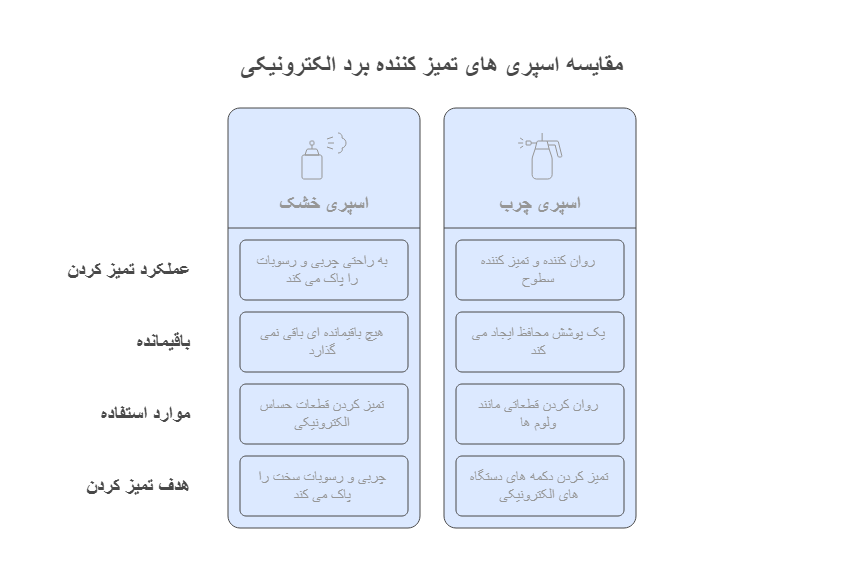 در پایان میتوان گفت مهمترین تفاوت اسپری چرب و خشک در نوع مواد تشکیلدهنده و کاربرد آنها است. اسپریهای خشک پاککننده و چربیزدایی قوی هستند که از آنها برای ازبینبردن چربی ناشی از لحیمکاری، نظافت هدهای مغناطیسی، سنسورها و حتی دکمههای تلفن استفاده میشود. در نتیجه قطعات حساس الکترونیکی مثل سوئیچها، رلههای برق، سوئیچهای تماسی با این اسپری بهراحتی تمیز شده و آسیبی به مدار وارد نمیشود. در مقابل اسپری روغنی برای روانسازی قسمتهای متحرک روی بعضی از دستگاه الکترونیک استفاده میشوند و در مقایسه با اسپری خشک کاربرد محدودتری دارند.