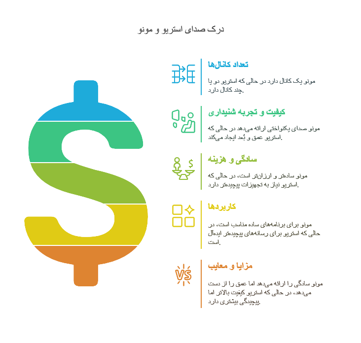 تجربه یکنواخت: در صدای مونو، همه صداها از یک جهت شنیده میشوند و این یکنواختی ممکن است جذابیت محتوای صوتی را کاهش دهد.