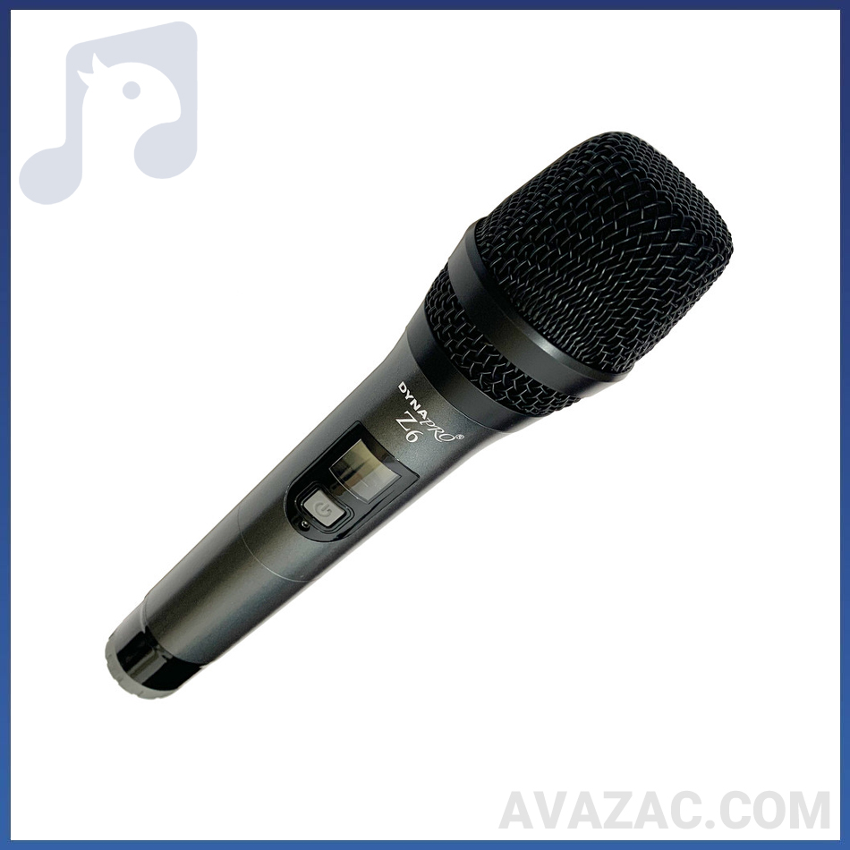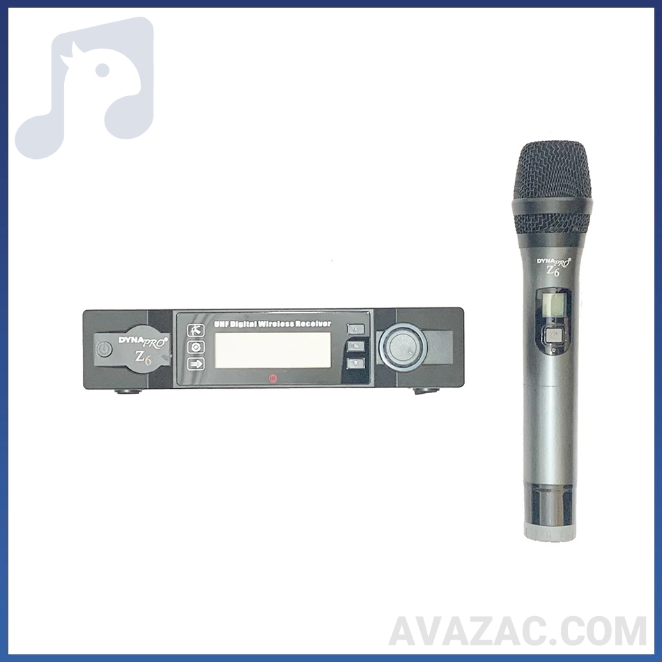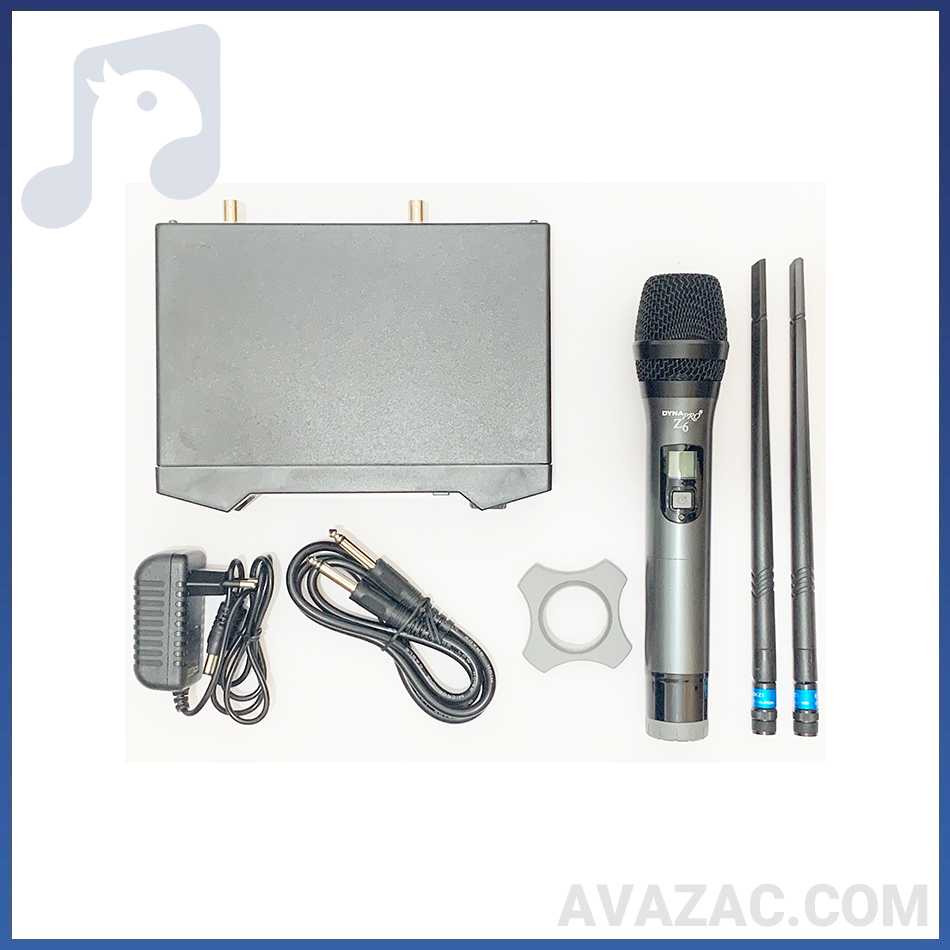 میکروفون بیسیم دستی دایناپرو مدل DYNAPRO Z6 دوکاناله همراه با یک میکروفون دستی می باشد. این میکروفن بی سیم بردی برابر با حدود ۵۰ الی ۱۰۰ متر دارد. میکروفن دایناپرو روی باند UHF قرار دارد و دارای قابلیت تغییر کانال فرکانسی می باشد. قرار داشتن روی باند فرکانسی UHF موجب می شود کاربر به راحتی و بدون از دست دادن کیفیت صدا بتواند حرکت کند.