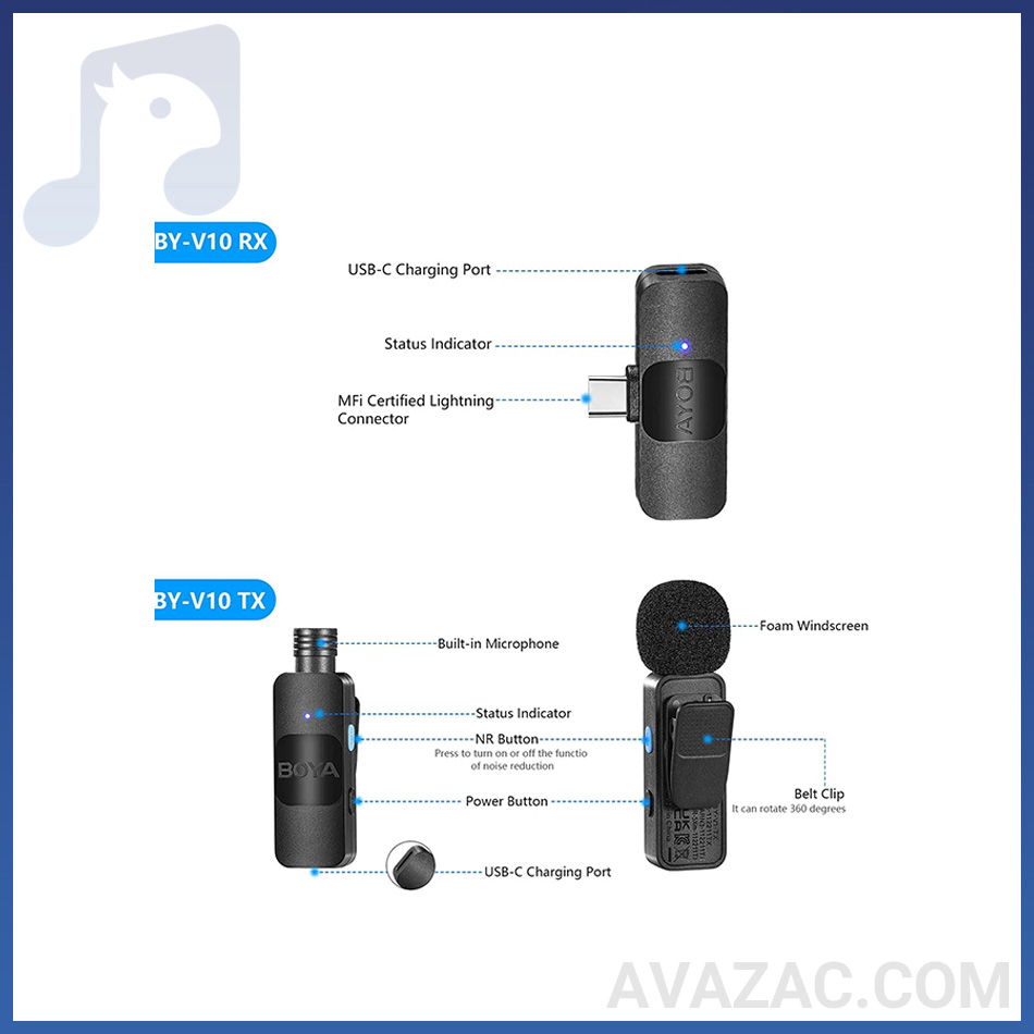 مشخصات ظاهری میکروفون یقه ای بی سیم بویا BY-V20 رابط تایپ سی نیز شامل موارد زیر خواهد شد.