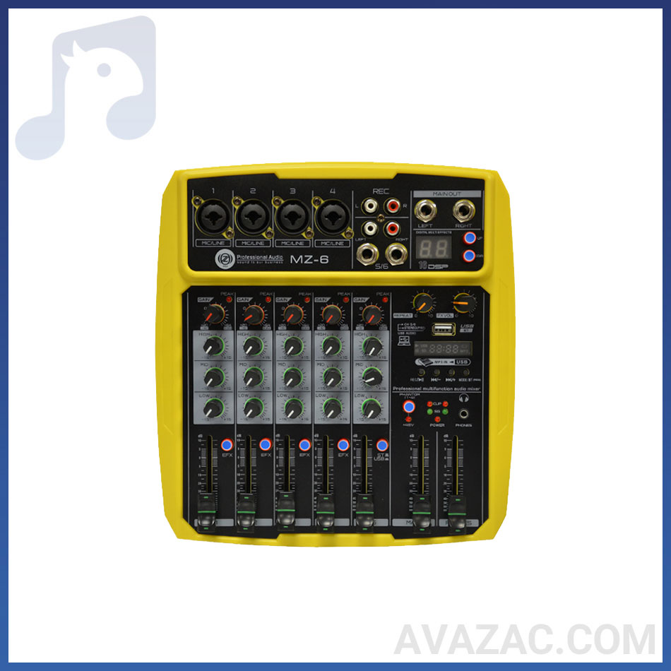 میکسر ZICO MZ-6 یک دستگاه حرفهای با 6 کانال ورودی، 4 ورودی میکروفون، فانتوم پاور 48 ولتی و کارت صدای داخلی است که برای استودیوهای کوچک و اجراهای زنده ایدهآل خواهد بود. این مدل با افکت دیجیتال 16 حالته، رکوردر داخلی، بلوتوث و ورودی USB، امکانات کاملی را ارائه میدهد. با این حال اگر تصمیم به خرید این میکسر را دارید، بد نیست با مشخصات فنی آن بیشتر آشنا شوید.