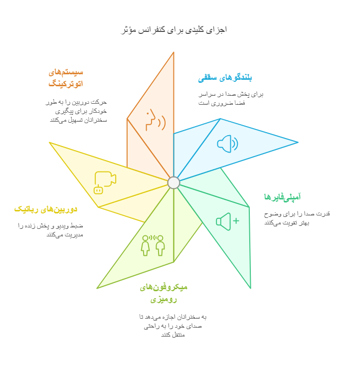 همانطور که میدانید در سالن کنفرانس تجهیزات زیادی قرار دارند تا شما بتوانید یک جلسه را خوب و با کیفیت پیش ببرید. مثلا بلندگوهای سقفی توکار از مهمترین اجزایی هستند که باید حتما در اتاق تعبیه شوند و آمپلی فایر پرقدرت هم باید برای تقویت آنها استفاده شود، ولی شما این وسایل را نمیبینید. برخی لوازم دیگر مثل میکروفون رومیزی کنفرانس، جلوی تمامی حاضرین قرار داده شده تا صدای خود را راحتتر به دیگران برسانند.