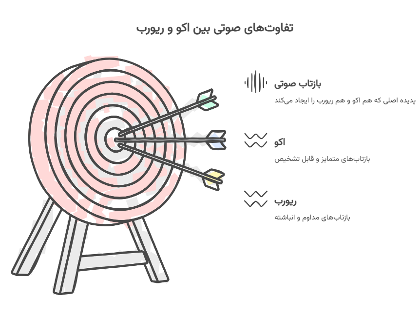 ما میتوانیم تفاوت این دو را هنگام تعریف کردن آنها درک کنیم. اکو نوعی موج صوتی است که با اندازه و تاخیر کافی منعکس شده یا در غیر این صورت بازگردانده میشود تا به عنوان موجی متمایز از موج منتقل شده، مستقیم قابل تشخیص باشد. از نظر عامیانه، اکو یک موج صوتی منعکس شده است که به طور شنیداری از صدای منبع متمایز است.